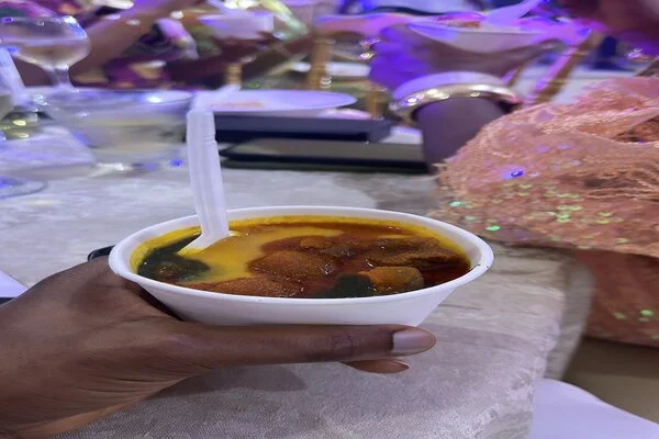BBNaija reality star, Saga Adeolu, sparked online discussions after expressing shock over the small “mini amala” served at a wedding event. His reaction quickly trended on social media, with Nigerians humorously reacting to the situation while some took the opportunity to criticize President Tinubu’s administration and the current economic struggles.