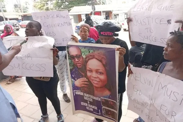 According to reports, Success, who was four months pregnant, was stabbed in the neck while lying in bed. The Edo State Police confirmed that an angry mob nearly attacked the suspect before he was taken into custody. Protesters from the Ikpoba Hill Market Women Association, holding placards with various messages, expressed outrage over rising cases of domestic violence.