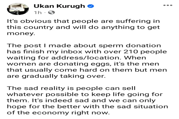 Ukan Kurugh, a Benue-based humanitarian, finds himself inundated with requests from "over 210" men expressing interest in sperm donation for financial gain. The unexpected surge in inquiries comes after Kurugh's recent post on social media, where he highlighted the urgent need for a sperm donor in Abuja, offering a substantial payment of 900K.