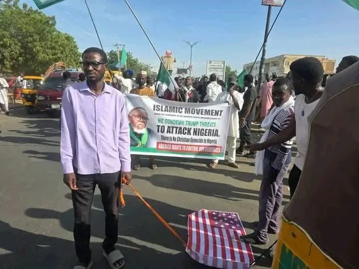 Members of the Islamic Movement in Nigeria (IMN), commonly known as Shi'ites, staged a protest in Kano on Saturday against potential U.S. military intervention in Nigeria. The demonstration featured dramatic symbolism, including dragging the American flag on the ground and displaying effigies of President Donald Trump.