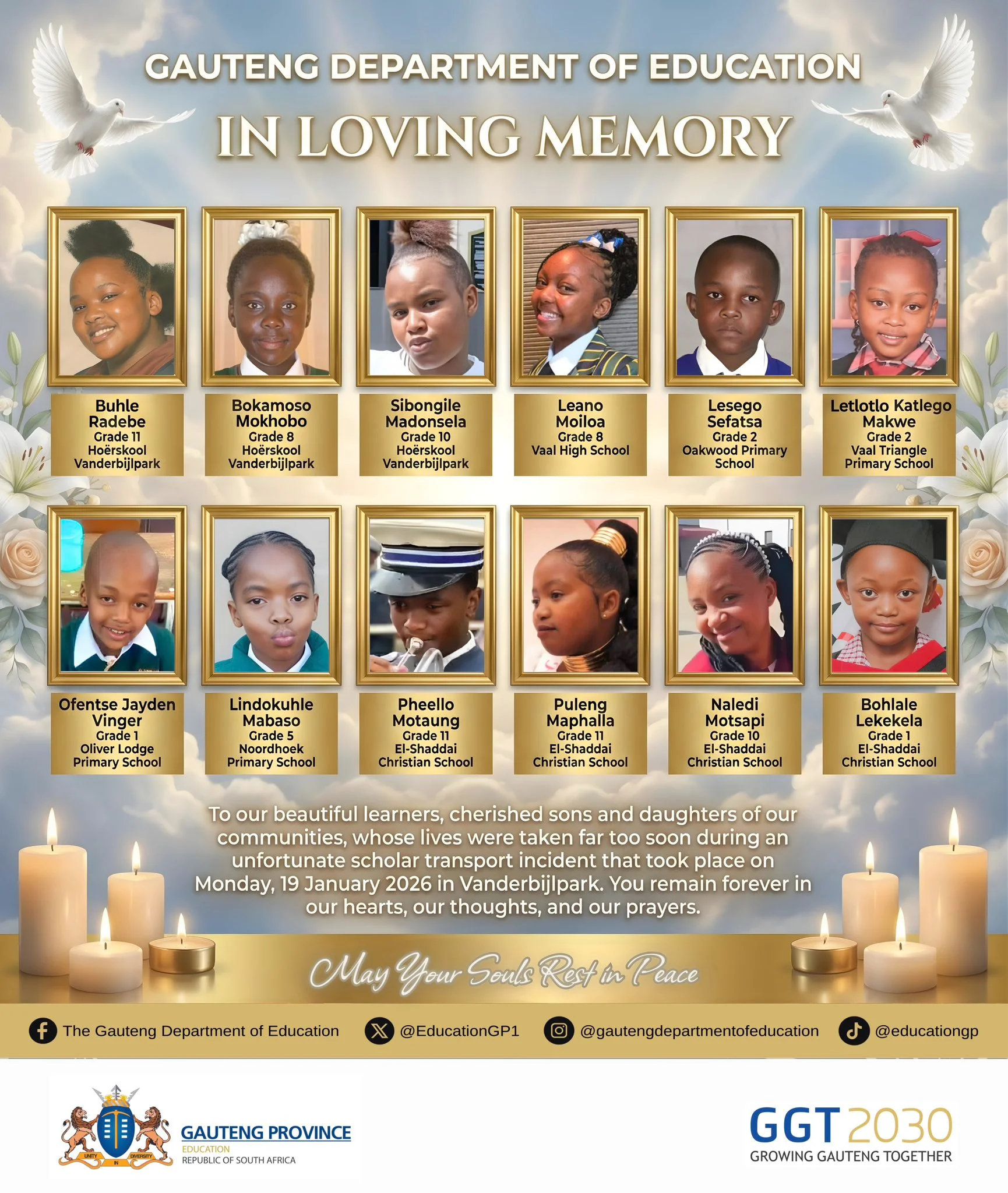 A 22-year-old driver, Ayanda Dludla, has been charged with 14 counts of murder following a head-on collision between a school transport vehicle and a truck in Vanderbijlpark, South Africa. The crash on January 19 killed 14 pupils and injured several others. Dludla, who was driving without a valid permit in an unlicensed vehicle, abandoned his bail application during a court appearance. The National Prosecuting Authority stated there is sufficient prima facie evidence to support the upgraded murder charges, as opposed to culpable homicide. The case has been postponed to March 5.