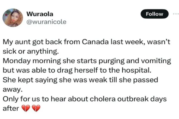 A Nigerian woman returning from Canada dies of cholera amid Lagos outbreak. Social media reports her death, raising alarms about the disease spread.