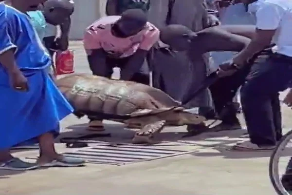 In a surprising turn of events, a gigantic tortoise was discovered roaming the streets of Maiduguri, Borno State, following severe flooding that impacted the area. A video circulating online captured the moment when several men struggled to lift the hefty tortoise, attracting a crowd of curious locals eager to witness the spectacle.