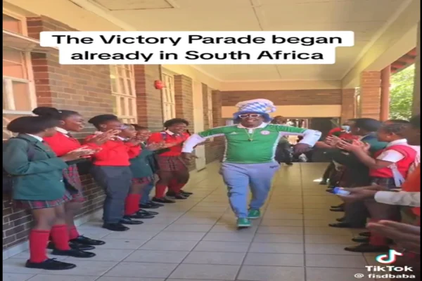 A Nigerian teacher arriving at a South African school this morning was greeted with a joyful guard of honor by students to celebrate Nigeria's win over South Africa. The heartwarming welcome included a playful touch, with the teacher sporting green shoes.