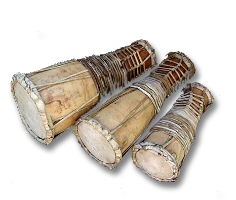 A set of batá consists of three drums of different sizes. The drums are similar in shape to an hourglass and each drum has two different sized heads. The batá are played sitting down with the drum placed horizontally on the knees. This allows the drummer to play with both hands.