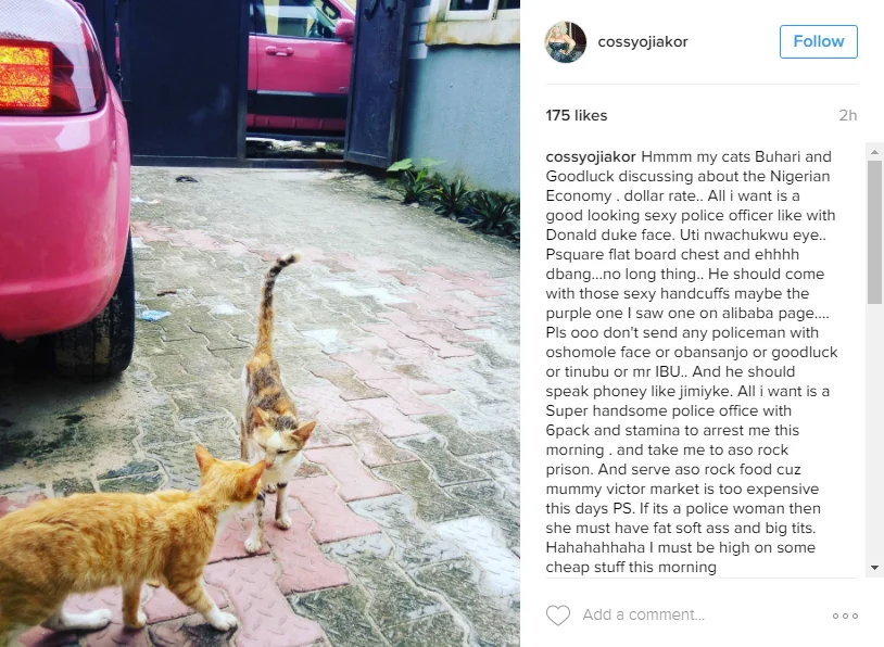 In an Instagram post, the actress wrote, ''Hmmm my cats Buhari and Goodluck discussing about the Nigerian Economy . dollar rate.. All i want is a good looking sexy police officer like with Donald duke face. Uti nwachukwu eye.. Psquare flat board chest and ehhhh dbang...no long thing.. He should come with those sexy handcuffs maybe the purple one I saw one on alibaba page.... Pls ooo don't send any policeman with oshomole face or obansanjo or goodluck or tinubu or mr IBU.. And he should speak phoney like jimiyke.