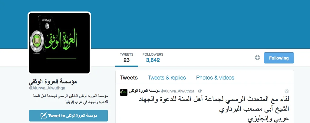 The account also has a video interview with Abu Mus'ab Albarnawi, who says he is the spokesman of the group. The video had the faces of both interviewer and interviewee blurred out.