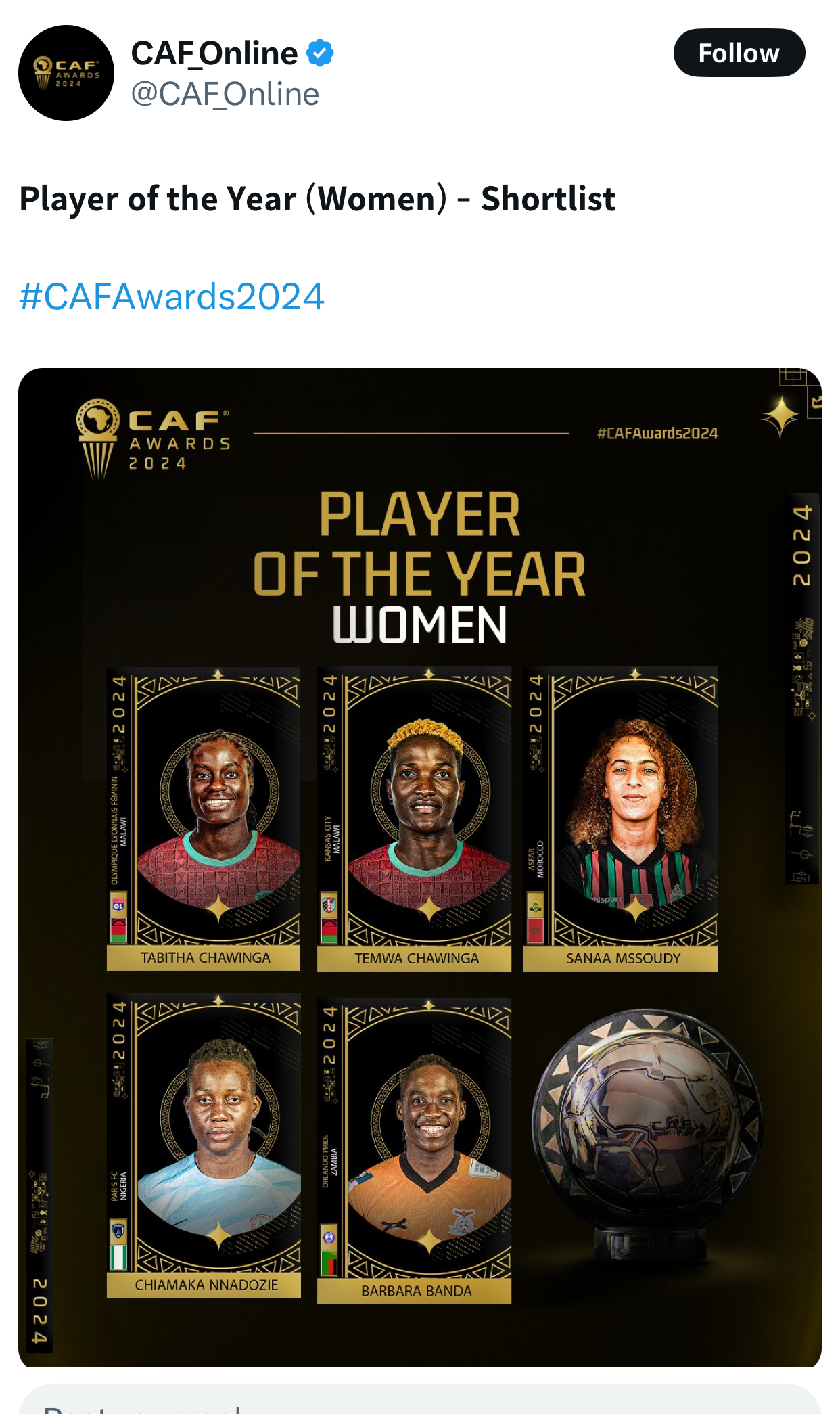 Nigerian goalkeeper, Chiamaka Nnadozie has been listed among the final five nominees for the 2024 CAF Women’s Player of the Year award. The African football governing body announced the top